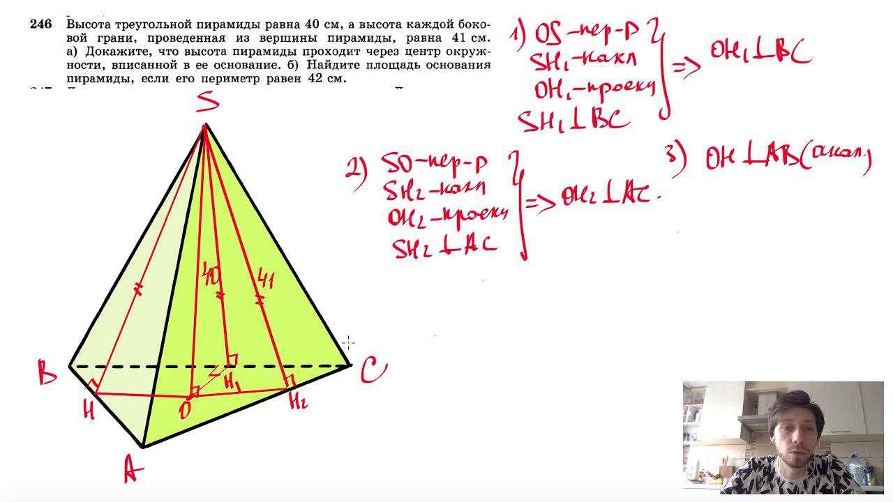 №246. Высота треугольной пирамиды равна 40 см, а высота каждой боковой грани, проведенная из вершины пирамиды, равна 41 см. а) Докажите, что высота пирамиды проходит через центр окружности, вписанной в ее основание; б) Найдите площадь основания пирамиды, если его периметр равен 42 см. Поддержать канал рублём - 5469400944002125 (Сбербанк) Мой второй канал для подготовки к ЕГЭ и ОГЭ - https://www.youtube.com/ЕвгенийСумин Инстаграм - https://www.instagram.com/EGE_OGE.math Личный инстаграм - https://www.instagram.com/ee_sumin VK - https://vk.com/evgeniysumin FB - https://www.facebook.com/EvgeniySumin