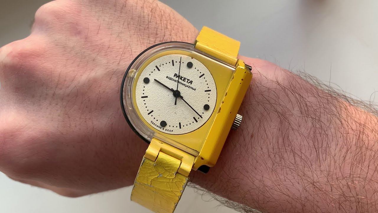 Видеообзор на уникальные музейные водонепроницаемые часы «Ракета» с оригинальным ремешком Петродворцового Часового Завода, оригинальная разработка конца 1980-х годов. На данный момент это единственный известный экземпляр таких часов, ранее были представлены только в каталоге 1989 года, а также в советской видеорекламе «Ракета». Оригинальная конструкция: корпус выполнен в виде плоского "стакана" с крышкой. Уплотнительная резинка квадратная, под крышкой. Механизм с циферблатом вставляются в желтый литой пластмассовый корпус с крышкой, и вся эта конструкция вставляется в так называемый прозрачный "стакан", изготовленный из оргстекла. Дуга на концах имеет резьбу и гайками стакан крепится к корпусу. Корпус не имеет ушек т.к. ремешок одевается на дугу и вся эта конструкция закрепляется двумя гайками. На задней части оргстекла заводская музейная бирка с номером внешнего оформления (4125723). Механизм «Плоская Россия» 2609.НА