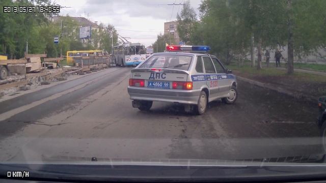 Троллейбус не мог объехать ремонт коммунальных сетей на ул. Д. Зверева Екатеринбург из за встречного транспорта. Инспектор ГИБДД остановил движение чтобы Троллейбус смог проехать.