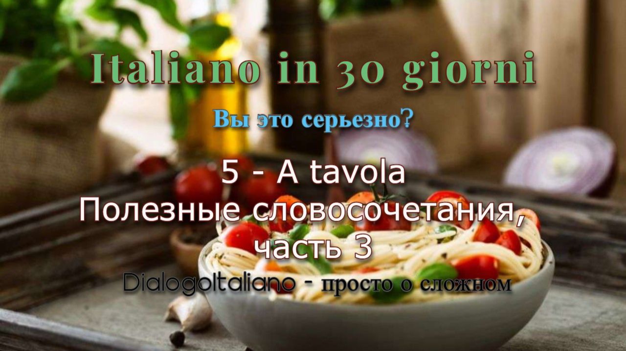 Приветствую всех начинающих изучать итальянский язык! Чтобы плодотворно изучать иностранный язык, очень важно не только читать слова и тексты, учить грамматику, но и много слушать иностранной речи. На первом этапе это, конечно, будет адаптированная речь текстов учебников. Вашему вниманию представляю учебный проект для начинающих "Italiano in 30 giorni - вы это серьезно?", который включает в себя видео-диалоги и видео-словари (опубликованные на RUTUBE), а также полные уроки с объяснениями и интерактивными заданиями, которые вы можете использовать для своего обучения на Дзене https://dzen.ru/dialogoitaliano и в ВК https://vk.com/dialogoitaliano В данном видео представлен список полезных словосочетаний к диалогу №5 "A tavola!" учебного проекта "Italiano in 30 giorni - вы это серьезно?". Видео-диалог №5 "A tavola!", словари, а также ролики с грамматическим материалом в соответствующем плейлисте №5 "A tavola!" https://rutube.ru/plst/1324435?r=wd