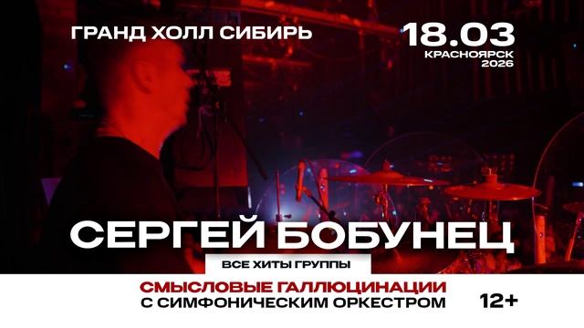 Сергей Бобунец с большим концертом в сопровождении симфонического оркестра 18 марта на сцене Гранд Холл Сибирь! Предводитель команды Вечно Молодых и хранитель главных смыслов о вечности, разуме и любви представляет программу, состоящую из хитов группы «Смысловые Галлюцинации» и лучших сольных песен с симфоническим оркестром.