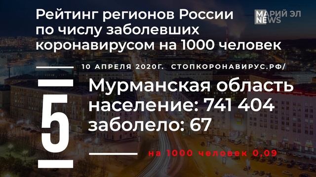 #МарийЭлNEWS #VNDPRESS #Йошкар_Ола #Марий_Эл Главные темы выпуска: Рейтинг регионов России по числу заболевших коронавирусом на 1000 человек. Данные с сайта: https://стопкоронавирус.рф/ Поддержите наш канал: Яндекс.Деньги: https://money.yandex.ru/to/41001391551479 https://www.youtube.com/c/VNDPRESS https://vk.com/vndpress https://www.facebook.com/groups/vndpress/ https://zen.yandex.ru/id/5a1725ad8c8be3aaa7bda628 Диктор https://vk.com/id176565090 Оператор, монтаж, звук https://vk.com/tdp1204 Сотрудничество: tdp1204@yandex.ru; +79194165036 Фото: Яндекс.Картинки