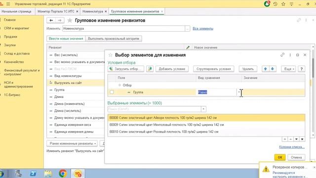 Групповое изменение свойства отвечающего за выгрузку на сайт Битрикс - Выгружать на сайт. Номенклатура - дополнительное свойство - "Выгружать на сайт" (Булево) Через обработки "Групповое изменение реквизитов"