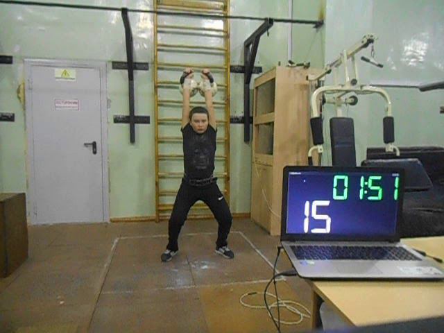 Гиревой спорт. Наумов Артём 2006 года рождения 1 этап Онлайн Кубка мира. Упражнение Толчок 2-х гирь по Длин. Циклу 8 кг 3 минуты 23.01.2021 года. Результат 38 подъёмов.