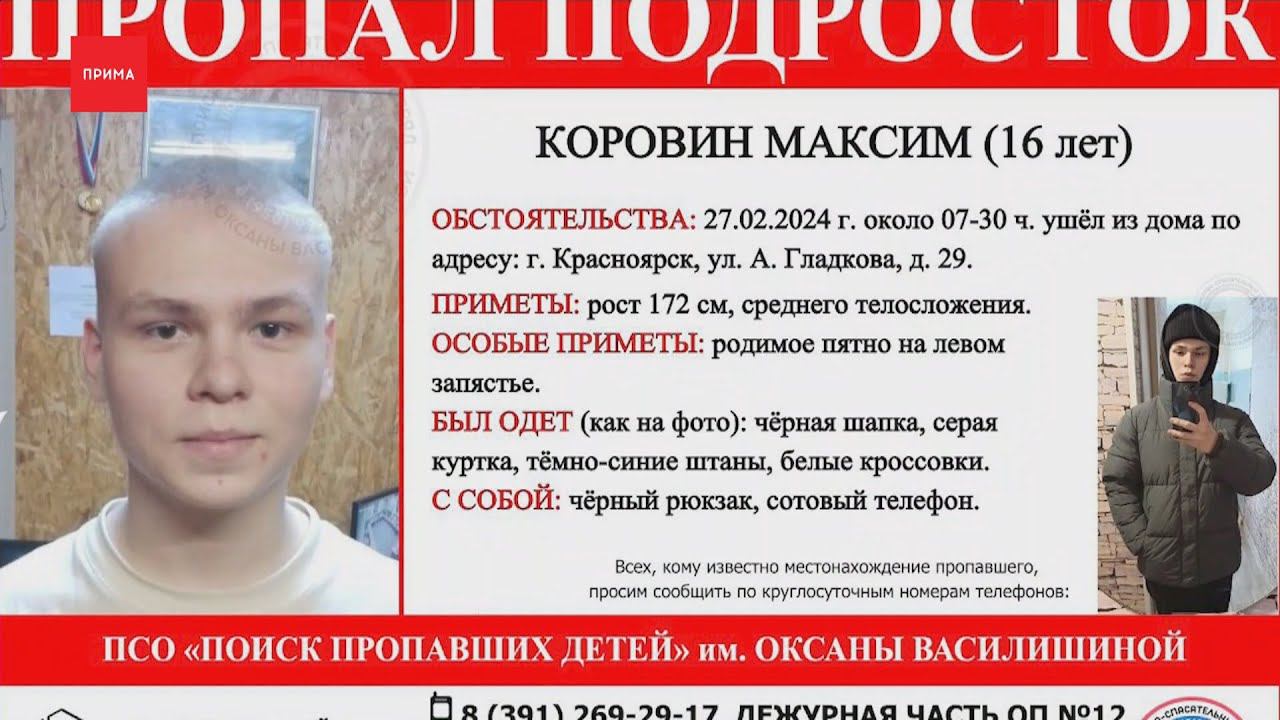 Уже больше недели в Красноярске ищут 16-летнего подростка. Он вышел из дома 28 февраля. С тех пор не выходил на связь. Максим Коровин пропал в районе улицы Гладкова, но сейчас может быть где угодно. Парень был одет во всё темное и белые кроссовки. Особые приметы: родимое пятно на левом запястье. Волонтёры предполагают, что подросток мог спрятаться у кого-то из знакомых. Родители мальчика просят сообщить любую информацию о нём, в том числе анонимно.
