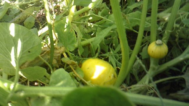 Пока тыква "Богатырская сила" проникает сквозь сетку забора, тыква сорт"Улыбка" проникла в неё!