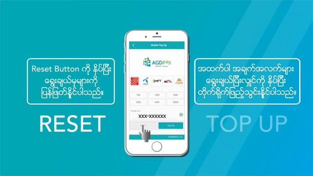 AGD Pay ကို အသံုးျပဳျပီး မည္သည္႔ Mobile Phone ကိုမဆို Top-up လုပ္နိုင္ျပီေနာ္။ MPT, Telenor, Ooredoo, MecTel ႏွင္႔ My Tel ႏွစ္သက္ရာ Mobile number မ်ားကို AGD Pay mobile application မွတဆင္႔ လြယ္ကူစြာ ျပဳလုပ္ႏိုင္ပါတယ္။ Top up တစ္ၾကိမ္ ျပဳလုပ္တိုင္း 2% Discount ရမွာပါ။ AGD Pay Update version ကို ပထမဦးစြာ Google Play store (or) Apple App store မွ ရယူပါ။ ျပဳလုပ္ပံုအဆင္႔ဆင္႔က... ၁။ AGD Pay Old version ကို uninstall လုပ္ပါ။ ၂။ AGD Pay Update version ကို ရယူပါ။ Google Play store https://play.google.com/store/apps/details?id=com.agd.upi (or) Apple store https://itunes.apple.com/us/app/agd-pay/id1079803639?mt=8 ၃။ Card Number ကို ရိုက္ထည္႔ျပီး Activation ျပန္လုပ္ဖို႔ေတာ႔ လိုတယ္ေနာ္။ (Card Number ေလးကို Activate မလုပ္ခင္ အရင္မွတ္ထားမယ္ေနာ္။) လြယ္ကူစြာျဖင္႔ AGD Pay နဲ႔ Mobile Top up ျပဳလုပ္ႏိုင္ပါျပီ။ သိပ္ကုိ ရိုးရွင္းလြယ္ကူၿပီး အဆင္ေျပလြန္းလို႔ပါ။ အဆင္ေျပမႈ မရွိပါက 01 239 9333 (သို႕) AGD Bank (or) AGD Pay Facebook page message box သို႔ စံုစမ္းေမးျမန္းႏိုင္ပါသည္။