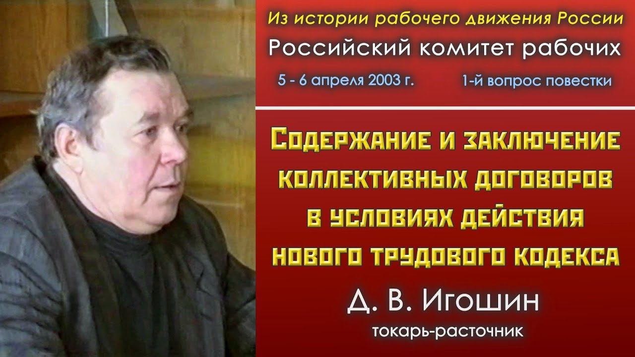 Из истории рабочего движения России. Семинар Российского комитета рабочих, Нижний Новгород, 05-06.04.2003. 1-й вопрос повестки. «Содержание и заключение коллективных договоров в условиях действия нового трудового кодекса». Содокладчик Дмитрий Васильевич Игошин - токарь-расточник, председатель Совета рабочих завода "Красное Сормово", сопредседатель Российского комитета рабочих, член РПР, Нижний Новгород. Ведут заседание рабочие Дмитрий Васильевич Игошин и Василий Иванович Шишкарёв. 00:00:22 - содокладчик Дмитрий Васильевич Игошин. 00:26:11 - Сергей Петрович Петров, оператор станков с ЧПУ, профсоюзная организация Пролетарского завода, г. Ленинград. 00:31:18 - Василий Иванович Шишкарёв, наладчик ЗИЛ, сопредседатель Российского комитета рабочих, член Рабочей партии России, г. Москва. 00:47:23 - Владимир Михайлович Кудрявцев, регулировщик радиоаппаратуры, завод Электромаш, член Рабочей партии России, Нижний Новгород. 01:06:22 - Михаил Кузьмич Лобов, заместитель председателя профкома завода «Красное Сормово», Нижний Новгород. 01:18:30 - Ирина Викторовна Рыбакова, Нижний Новгород. 01:22:45 - Владимир Николаевич Ясаков, председатель профкома Соцпроф Нижегородского государственного академического театра оперы и балета, Нижний Новгород. 01:40:21 - Вера Андреевна Лисецкая, маляр Волжского автомобильного завода, профсоюз «Единство». 02:03:34 - Олег Васильевич Шеин, депутат Государственной Думы. 02:13:49 - Александр Николаевич Николаев, электромеханик лифтового хозяйства, заместитель председателя профсоюза «Защита» гостиницы «Россия», член РКРП, г. Москва. 02:18:11 - Михаил Васильевич Попов, профессор СПбГУ, кафедра экономики и права, консультант портового комитета Российского профсоюза докеров морского порта г. Санкт-Петербурга, консультант РКР, г, Ленинград. 02:33:31 - с заключительным словом содокладчик Дмитрий Васильевич Игошин. 02:36:43 - с заключительным словом докладчик Константин Васильевич Федотов, представитель портового комитета профсоюза докеров, член Рабочей партии России, г. Ленинград. 02:41:27 - с проектом резолюции по 1-му вопросу Владимир Михайлович Кудрявцев. Как вступить в Рабочую партию России: http://www.r-p-w.ru/kak-vstupit-v-rabochuyu-partiyu-rossii.html ___ Для пожертвований в Фонд Рабочей Академии: Карта Сбербанка: 5469550034869302 Михаил Васильевич П. _ Для улучшения работы видеоканала ФРА: Карта Альфа-банка: 4154812035337157 _ _ ___ Веб-сайт Рабочая партия России: http://www.r-p-w.ru РПР ВКонтакте: https://vk.com/rabparty Сайт Северо-кавказского отделения РПР: https://rpw-krd.ru Сайт Дальневосточного отделения ФРА: Сайт Нижегородской организации РПР: Рекомендуем программы для скачивания видео и звука с нашего видеоканала: TubeMate - есть на сайте 4pda.ru (для Android), MediaHuman YouTube Downloader - есть на торрентах (для Windows).