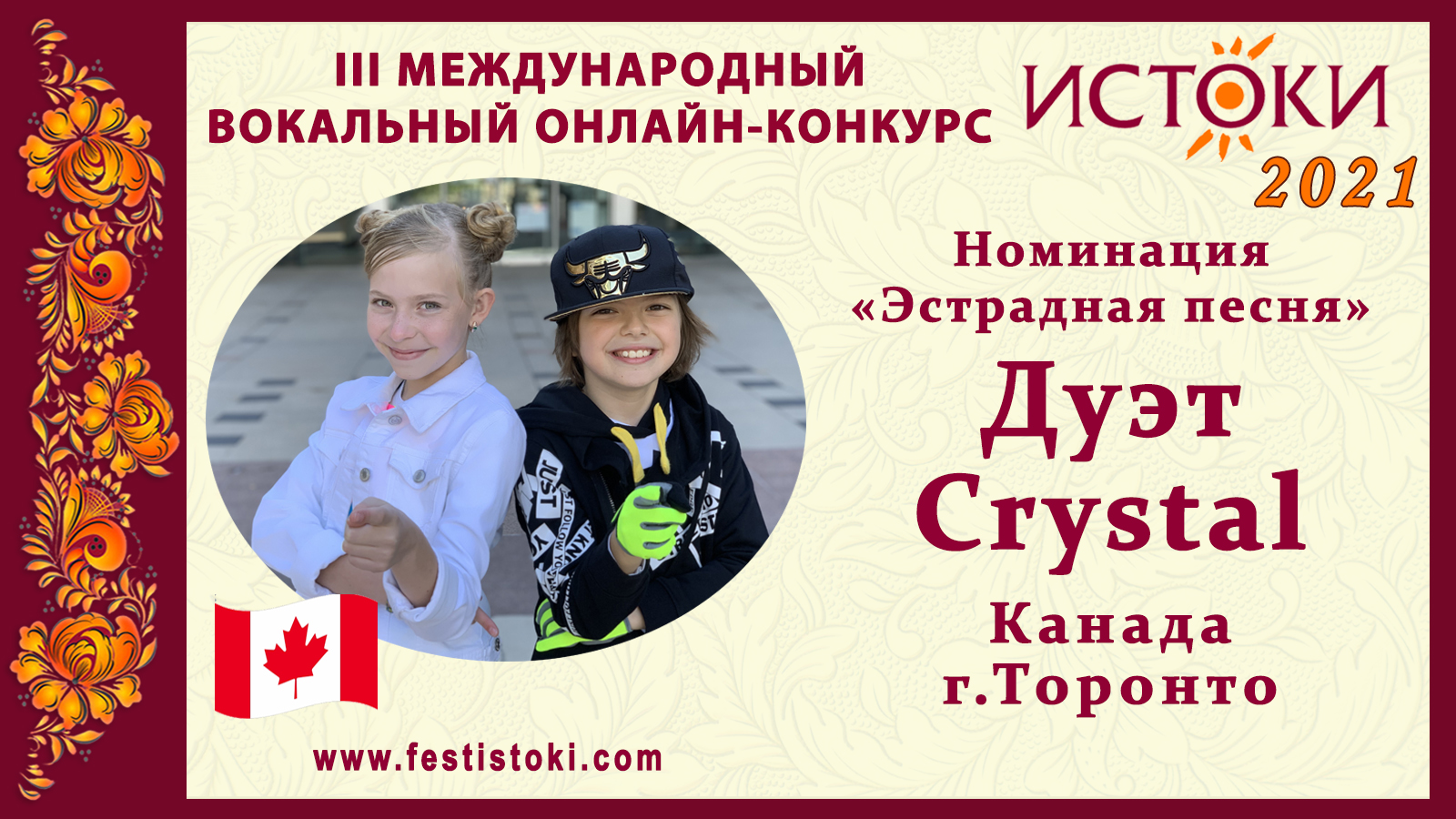 Лауреат III степени III Международного вокального онлайн-конкурса «Истоки». Номинация "Эстрадная песня". Песня "Say, Say, Say". Авторы Пол Маккартни и Майкл Джексон. Сайт: www.festistoki.ru / www.festistoki.com E-mail: festistoki@mail.ru