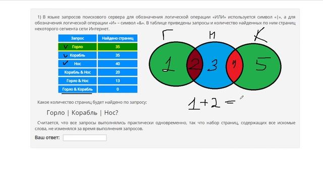 http://egoroffartem.pythonanywhere.com/ege/task/17 На сайте размещены другие задания по этой теме http://egoroffartem.pythonanywhere.com/ege/videotask/17 Список всех разборов 17 задания из ЕГЭ по информатике: https://www.egoroffartem.ru/ege/videotask/ Видео решения задач по ЕГЭ информатике ЕГЭ Информатика Демоверсия 2019 В языке запросов поискового сервера для обозначения логической операции «ИЛИ» используется символ «|», а для обозначения логической операции «И» – символ «&». В таблице приведены запросы и количество найденных по ним страниц некоторого сегмента сети Интернет. Запрос Найдено страниц Горло 35 Корабль 35 Нос 40 Корабль & Нос 20 Горло & Нос 13 Горло & Корабль 0 Какое количество страниц будет найдено по запросу: Горло | Корабль | Нос? Считается, что все запросы выполнялись практически одновременно, так что набор страниц, содержащих все искомые слова, не изменялся за время выполнения запросов.