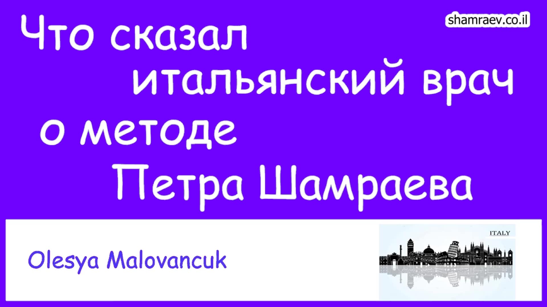 Что сказал итальянский врач о методе Петра Шамраева. Рассеянный склероз (2021) Дополнительную информацию можно получить по скайпу: petrshamraev с 8:00 до 22:00 (время московское) Руководитель Психотерапевтического Исследовательского Центра автор открытия в области медицины психолог-психотерапевт Петр Шамраев Тел: +972-52-529-95-91 Skype: petrshamraev E-mail: petrshamraev@gmail.com Web: http://shamraev.co.il YouTube: https://www.youtube.com/@user-di4oi5lk7q YouTube: https://www.youtube.com/@user-tb6ej6ol2b/videos RuTube: https://rutube.ru/channel/10134425/videos/ Одноклассники: https://ok.ru/kakvylech Вконтакте: https://vk.com/id342874893 Dzen.ru: https://dzen.ru/id/60c06e755fe9c068e6ba4b1d Vimeo: https://vimeo.com/user183147794 Livejournal: https://petrshamraev.livejournal.com/ TikTok: https://www.tiktok.com/@petrshamraev?lang=ru-RU Instagram: https://www.instagram.com/petr._shamraev/ Подпишитесь на мой канал, и вы всегда будете в курсе последних открытий #петршамраев #каквылечитьрассеянныйсклероз #эмоциональныйкапитал