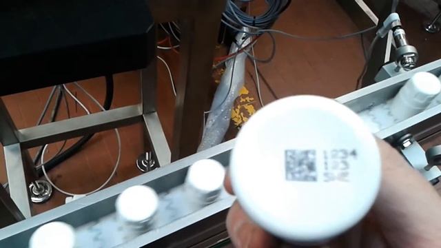 Hitachi RXS per marcatura da sotto su barattolo in plastica con 3 linee di testo e Codice QR per l'industria farmaceutica, composizione di data matrix. Scopri le caratteristiche delle stampanti industriali Hitachi sul sito: www.marking.it
