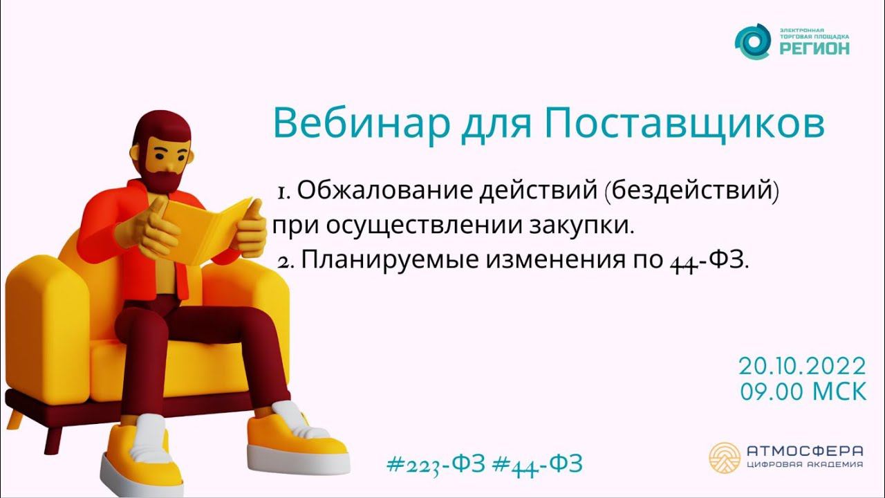 Подписывайтесь на нас в социальных сетях, чтобы не пропустить свежие новости: https://academy-atmosphere.ru/zakupki https://t.me/academy_atmosfera https://vk.com/academy_atmosfera https://rutube.ru/channel/24606397/ 00:45 Приветствие спикера Елена Борисовна Балякина 00:54 ОБЖАЛОВАНИЕ ДЕЙСТВИЙ (БЕЗДЕЙСТВИЙ) ПРИ ОСУЩЕСТВЛЕНИИ ЗАКУПКИ. 01:08 Нормативная база 04:18 Субъекты контроля (чьи действия (бездействия) могут быть обжалованы) 06:25 Порядок обжалования 14:16 Кто может подать жалобу? 17:22 Полномочия для подписания жалобы по 44-ФЗ 19:21 Форма подачи жалобы 22:18 Сроки подачи жалобы 25:05 Что делать, если Вы пропустили срок для подачи жалобы в ФАС 28:07 Содержание жалобы, предъявляемой в ФАС 31:24 Основания возвращения жалобы 32:04 Отзыв жалобы 34:08 Результат рассмотрения жалобы 37:15 Срок обжалования решения или предписания УФАС 37:21 Можно ли подать жалобу на действия заказчика, осуществляющего закупки по Закону 44-ФЗ, по правилам Закона 135-ФЗ? 38:44 Зачем подавать жалобу? 38:48 Конституция РФ 39:51 Некоторые причины подачи жалобы на действия (бездействия) субъектов контроля 41:51 Пример необоснованного допуска заявки 43:33 Пример необоснованного отклонения заявки 47:06 Пример завышенных требований к участникам 48:53 Основания подачи жалобы по 223-ФЗ 52:20 Выводы по разделу и ответы на вопросы 01:05:59 Презентация "РИАЛ" 01:07:24 Приветствие спикера Султанова Лилия Файласовна 01:07:55 ПЛАНИРУЕМЫЕ ИЗМЕНЕНИЯ ПО 44-ФЗ 01:08:18 Изменения в 44-ФЗ с 01.10.2022 01:32:03 Изменения в 44-ФЗ с 01.01.2023 01:39:04 Изменения в 44-ФЗ с 18.10.2022 01:40:51 Изменения в 44-ФЗ с 01.01.2023 01:51:36 Итоги и ответы на вопросы