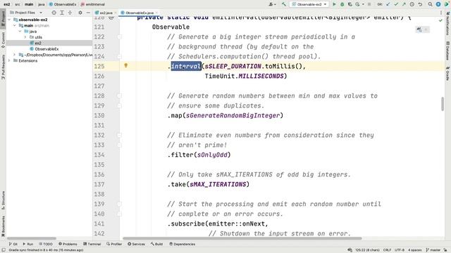 This video walks through a case study that explores how to use the RxJava Observable operators to create large random BigInteger objects & asynchronously check if they are prime in a background thread. Part 1 of this case study focuses on the RxJava create(), interval(), map(), doOnNext(), doOnComplete(), take(), subscribeOn(), subscribe(), filter(), and ignoreElements() operators. All the code shown in this case study is available in open-source form from https://github.com/douglascraigschmidt/LiveLessons/tree/master/Reactive/Observable/ex2.