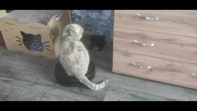 Кошка Плюша катается на роботе-пылесосе.
