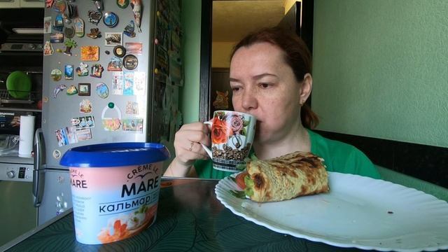 Мукбанг, на завтрак овсяно блин с начинкой.