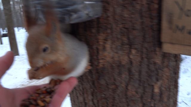 Прибежало много белок. Пытаюсь всех накормить