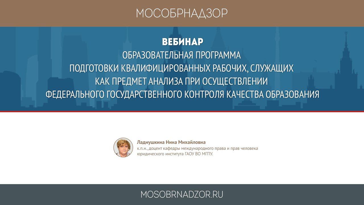 Вебинар «Образовательная программа подготовки квалифицированных рабочих, служащих как предмет анализа при осуществлении федерального государственного контроля качества образования» был проведен в рамках проекта Мособрнадзор.РФ 22 апреля 2019 года. Ведущая вебинара - Ладнушкина Н.М. Страница вебинара на сайте проекта - http://mosobrnadzor.ru/supervision/webinars/2019-04-22_13-00