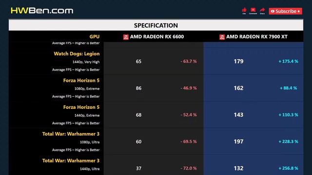 AMD Radeon RX 6600 vs AMD Radeon RX 7900 XT - 15 Games 1080p 1440p (R7 7800X3D) SYSTEM SPECS CPU: AMD Ryzen 7 7800X3D Motherboard: Gigabyte x670 Aorus Master RAM: 32GB DDR5 6000 CPU Cooler: AIO 360 Liquid OS: Windows 11 ReBar: ON GAMING BENCHMARK 1 - Fortnite 2 - Resindent Evil 4 3 - A Plague Tale: Requiem 4 - F1 2022 5 - Cyberpunk 2077 6 - Dying Light 2 Stay Human 7 - Watch Dogs: Legion 8 - Forza Horizon 5 9 - Total War: Warhammer 3 10 - Marvel’s Spider-Man Remastered 11 - Hogwarts Legacy 12 - Halo Infinite 13 - The Last of Us 14 - Call of Duty: Modern Warfare 2 15 - Hitman 3 16 - Average FPS 17 - Power Consumption Source: https://hwben.com/amd-radeon-rx-6600-vs-amd-radeon-rx-7900-xt-15-games-1080p-1440p-r7-7800x3d/ Other benchmark: https://hwben.com BUY FROM AMAZON - AMD Radeon RX 6600 : https://hwben.com/noindex/buy.php?q=AMD+Radeon+RX+6600 - AMD Radeon RX 7900 XT : https://hwben.com/noindex/buy.php?q=AMD+Radeon+RX+7900+XT #RX6600 #RX7900XT