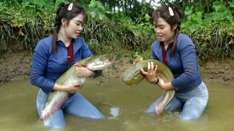 Девушка осушает пруд насосом и ловит рыбу. Жизнь во Вьетнаме