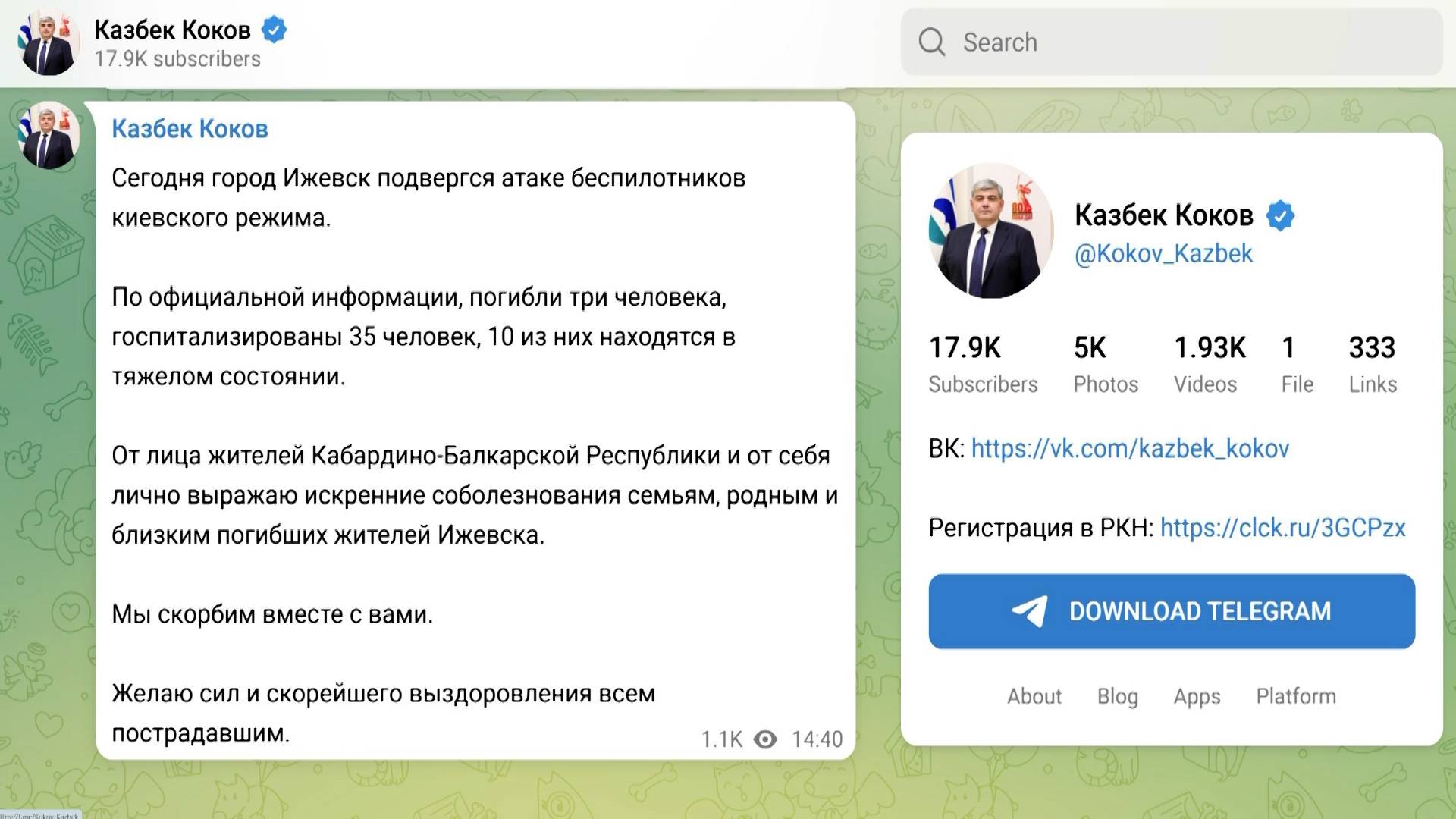 От лица жителей Кабардино-Балкарии и от себя лично выражаю искренние соболезнования семьям, родным и близким погибших жителей Ижевска. Мы скорбим вместе с вами. Желаю сил и скорейшего выздоровления всем пострадавшим, написал глава Кабардино-Балкарии в Телеграме. По официальной информации, погибли три человека, госпитализированы 35 человек, 10 из них находятся в тяжелом состоянии.