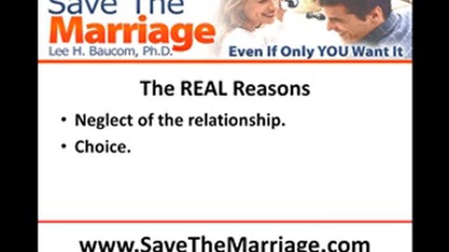 http://www.SaveTheMarriage.com Do you know the reasons marriages fail? If you want to save your marriage, you need to start by knowing the reasons of what went wrong. Then you can fix your marriage. Start saving your marriage here.