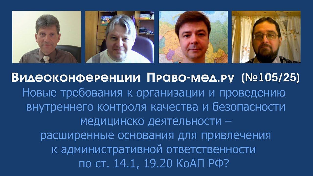 Видеоконференция Право-мед.ру № 105 (25) от 11 октября 2018 года на которой обсуждался проект приказа МЗ РФ «Об утверждении требований к организации и проведению внутреннего контроля качества и безопасности медицинской деятельности». Тема: «Новые требования к организации и проведению внутреннего контроля качества и безопасности медицинской деятельности – расширенные основания для привлечения к административной ответственности по ст. 14.1, 19.20 КоАП РФ? » Рассмотренные вопросы 1. Причины изменения правового регулирования внутреннего контроля качества и безопасности медицинской деятельности? 2. Обоснованность детальной регламентации внутреннего контроля качества и безопасности медицинской деятельности? 3. Влияние новых требований на интересы пациентов, медицинских работников, медицинских организаций? Список участников: Панов Алексей Валентинович, главный редактор информационного портала Право-мед.ру, г. Омск , член АЮР Печерей Иван Олегович, партнер юридической группы "Ремез, Печерей и партнеры", г. Москва Гаганов Дмитрий Борисович, юрист в сферы медицины, г. Санкт-Петербург Карпенко Андрей Александрович, руководитель Московского филиала "Центра медицинского права"