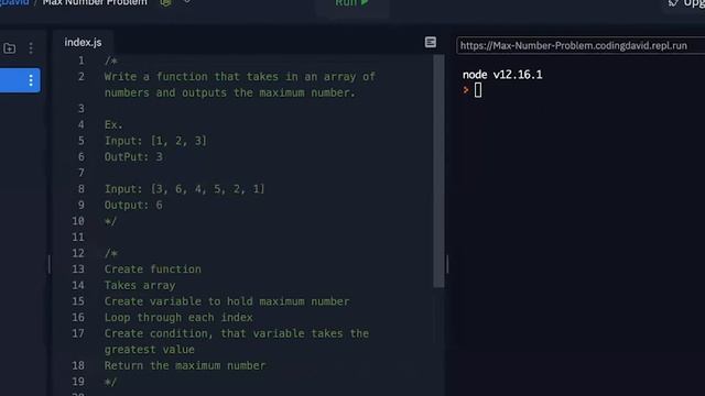 Write a function that takes in an array of numbers and outputs the maximum number. Ex. Input: [1, 2, 3] Output: 3 Input [3, 6, 4, 5, 2, ,1] Output:6 Here is my video explanation of how I solved the problem in Javascript.