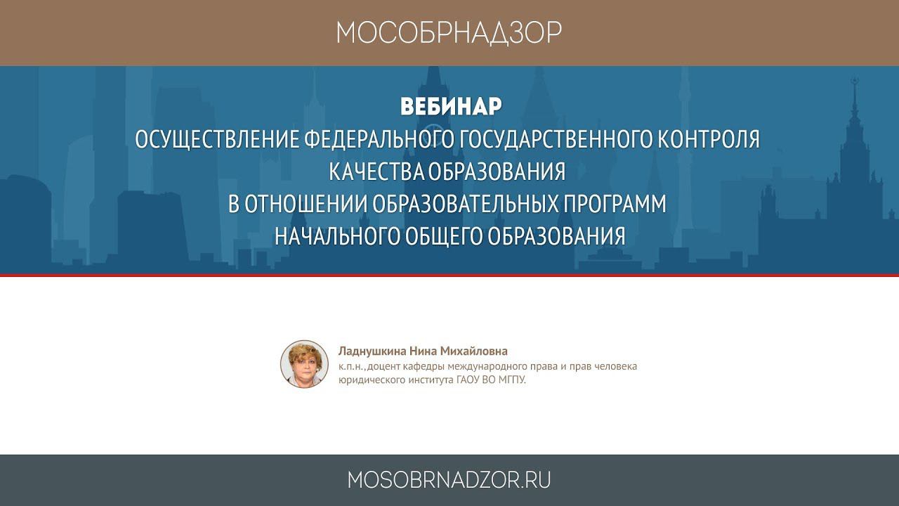 Вебинар «Осуществление федерального государственного контроля качества образования в отношении образовательных программ начального общего образования» был проведен в рамках проекта Мособрнадзор.РФ 7 ноября 2017 года. Ведущая вебинара - Ладнушкина Н.М. Страница вебинара на сайте проекта - http://mosobrnadzor.ru/supervision/webinars/2017-11-07_15-00