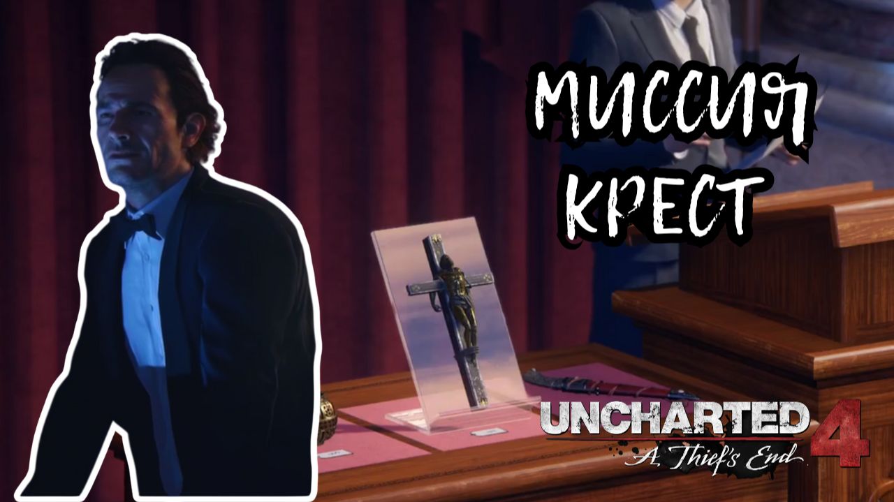 В нашей серии мы приступили к поиску сокровищ. Чтобы найти какие-то зацепки, нам нужен был крест, такой же, как Сэм нашел в одной из башен адово места. Только тот был пустой внутри, а тот, который мы ищем — нет. У нас есть предположение, что внутри этого креста лежит карта или какая-то подсказка, где спрятаны сокровища. Просто прийти и взять крест невозможно, так как его продают на аукционе. И был придуман блестящий план — просто украсть его, но это тоже не легкая задача, так как крест находится под охраной и на виду у всех. Нейту пришлось пробираться по зарослям и вентиляционным ходам, чтобы выключить рубильник. Сэм же раздобыл костюм официанта и караулил в зале возле креста. Когда свет отключился на секунды, операция была успешно выполнена: крест похищен.