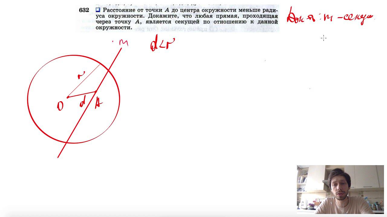 №632. Расстояние от точки А до центра окружности меньше радиуса окружности. Докажите, что любая прямая, проходящая через точку А, является секущей по отношению к данной окружности. Поддержать канал рублём - 5469400944002125 (Сбербанк) Мой второй канал для подготовки к ЕГЭ и ОГЭ - https://www.youtube.com/ЕвгенийСумин Инстаграм - https://www.instagram.com/EGE_OGE.math Личный инстаграм - https://www.instagram.com/ee_sumin VK - https://vk.com/evgeniysumin FB - https://www.facebook.com/EvgeniySumin