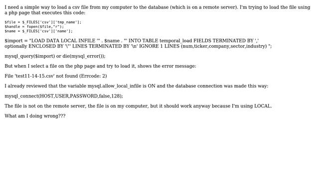 Databases: Load csv file to mysql using load data local infile Helpful? Please support me on Patreon: https://www.patreon.com/roelvandepaar With thanks & praise to God, and with thanks to the many people who have made this project possible! | Content (except music & images) licensed under CC BY-SA https://meta.stackexchange.com/help/licensing | Music: https://www.bensound.com/licensing | Images: https://stocksnap.io/license & others | With thanks to user Erik Darling (dba.stackexchange.com/users/32281), user David Sichizya (dba.stackexchange.com/users/165441), user Claudia Sanchez (dba.stackexchange.com/users/79923), and the Stack Exchange Network (dba.stackexchange.com/questions/121893). Trademarks are property of their respective owners. Disclaimer: All information is provided "AS IS" without warranty of any kind. You are responsible for your own actions. Please contact me if anything is amiss at Roel D.OT VandePaar A.T gmail.com