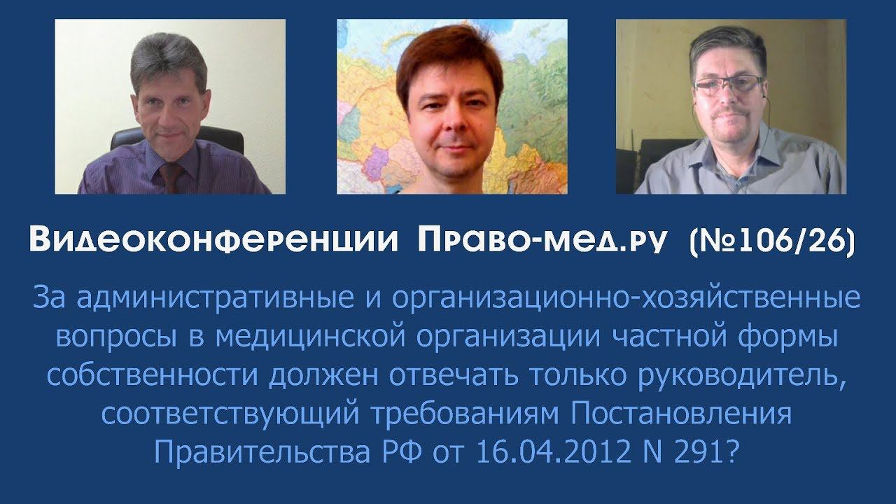 Видеоконференция Право-мед.ру № 106 (26) от 16 октября 2018 года на которой обсуждалась судебная практика Верховного Суда России Тема: «За административные и организационно-хозяйственные вопросы в медицинской организации частной формы собственности должен отвечать только руководитель, соответствующий требованиям Постановления Правительства РФ от 16.04.2012 N 291?» Рассмотренные вопросы 1. Влияние судебной практики Верховного Суда Российской Федерации в деле об оспаривании предписания Росздравнадзора (определение ВС РФ от 19 сентября 2018 г. № 308-КГ18-13416) на формирование единоличных исполнительных органов медицинских организаций и осуществление лицензионного контроля Росздравнадзором за медицинской деятельностью. Список участников: Панов Алексей Валентинович, главный редактор информационного портала Право-мед.ру, г. Омск , член АЮР Карпенко Андрей Александрович, руководитель Московского филиала "Центра медицинского права" Коршунов Александр Геннадьевич , адвокат, г. Челябинск