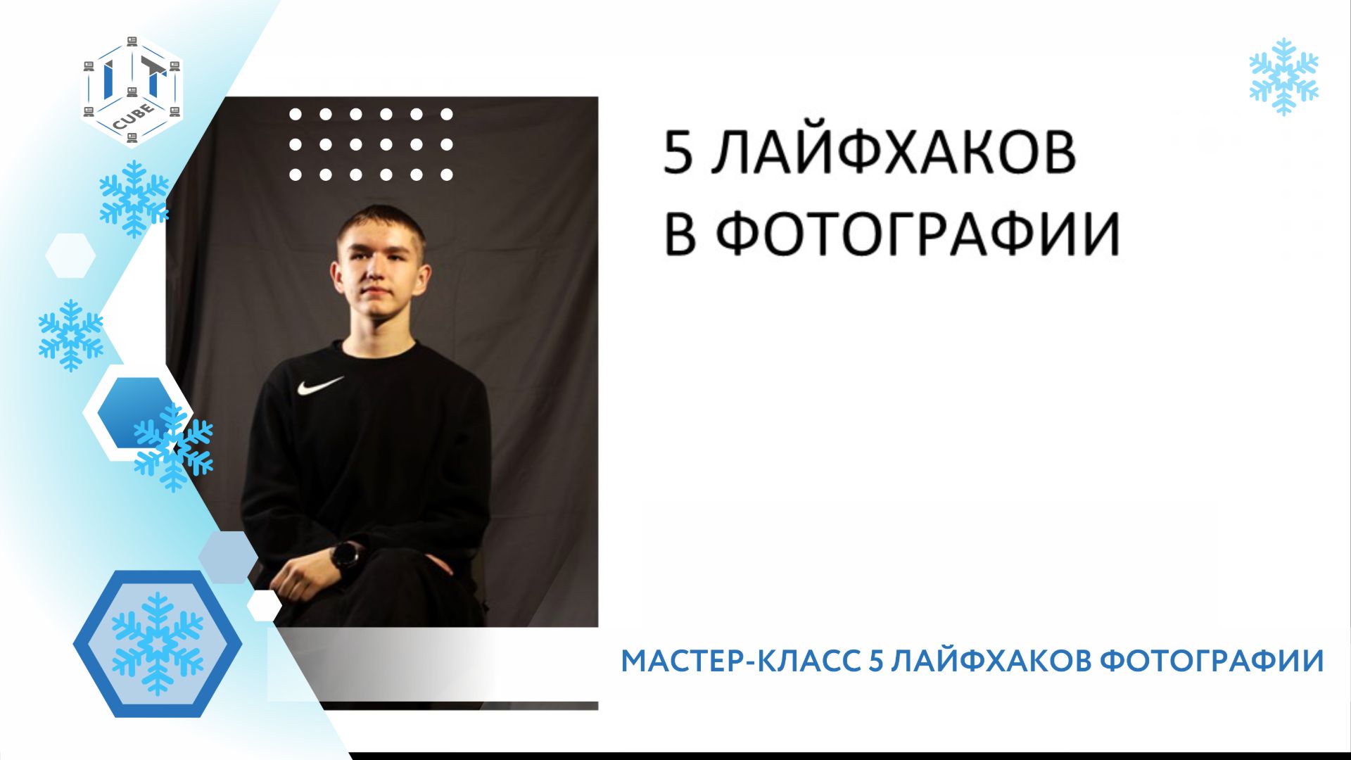 Сегодня свой мастер-класс на тему: 5 лайфхаков фотографии, проведет для вас педагог центра “ТЕХНО-IT-куб” Марина Прокопьева и ученики Медиашколы. Мастер‑класс рассчитан для начинающих и более опытных любителей фотографии. Мы поговорим про оборудование, фон, правильную постановку света, про позировки и обработку фото.