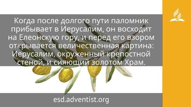 Песнь восхождения. Возвожу очи мои к горам, откуда придет помощь моя. Помощь моя от Господа, сотворившего небо и землю (Пс. 120:1, 2). Псалом 120 находится среди раздела книги Псалтирь под названием «Песни восхождения» (Пс. 119–133). Эти псалмы пели паломники на пути к Иерусалимскому храму, куда закон предписывал совершать паломничество не менее трех раз в год: «в праздник опресноков, в праздник седмиц и в праздник кущей» (Втор. 16:16). Город Иерусалим находится на плато в Иудейских горах на высоте 650–840 метров над уровнем моря, поэтому в город надо восходить. Если читать «Песни восхождения» последовательно, то перед нами предстанет весь путь паломника. Путешествие начинается в далекой земле: «Горе мне, что я пребываю у Мосоха, живу у шатров Кидарских» (Пс. 119:5). Мосох — центр Анатолии или Малой Азии. Кидар — Аравийский полуостров. Отправляясь в путь, паломник полагается на Божью защиту: «Не даст Он поколебаться ноге Твоей, не воздремлет хранящий тебя» (Пс. 120:3). Когда после долгого пути паломник прибывает в Иерусалим, он восходит на Елеонскую гору, и перед его взором открывается величественная картина: Иерусалим, окруженный крепостной стеной, и сияющий золотом Храм. Сотни таких же путешественников идут рядом и с воодушевлением поют: «Возрадовался я, когда сказали мне: „пойдем в дом Господень“. Вот, стоят ноги наши во вратах твоих, Иерусалим» (Пс. 121:1, 2). Там, в самом сердце храма, в Святом святых, сияет незримый свет небесной славы — там присутствует Сам Бог, и они пришли поклониться Ему. Псалмы 122–132 содержат молитвы паломников, которые произносились на празднике в храме. Везде царит дух радости и единства: «Как хорошо и как приятно жить братьям вместе!» (Пс. 132:1). Когда праздники заканчиваются, паломники, отправляясь в обратный путь, с Елеонской горы оглядываются на Иерусалим и видят сверкающий золотом храм. В их сознании еще звучат слова благословения, произнесенные священником: «Благословит тебя Господь с Сиона, сотворивший небо и землю» (Пс. 133:3). https://esd.adventist.org/library/periodicals/ezhednevnyie-chteniya/ #адвентисты #АдвентистыСедьмогоДня #Церковь #ЦерковьАдвентистовСедьмогоДня #ЦерковьХристианАдвентистовСедьмогоДня