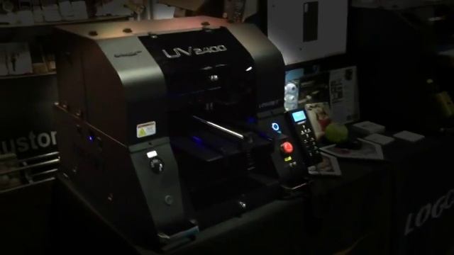 A brief view of our new LogoJET UV2400 UV-LED Direct to Substrate Printer in action. See the UV LED Lamp working as the print head passes over the products, with a closeup view of white ink being printed on a laptop case!