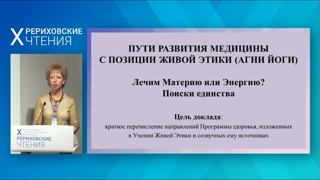 Доклады конференции "Х Рериховские чтения". 21-23 марта 2020, Музей Н.К.Рериха, Новосибирск. 23 МАРТА, ДНЕВНОЕ ЗАСЕДАНИЕ. 25. Евгения Владимировна ЖАЛОВА, Руководитель центра народной медицины «Искусство здоровья», г. Тюмень. «ПУТИ РАЗВИТИЯ МЕДИЦИНЫ С ПОЗИЦИЙ ЖИВОЙ ЭТИКИ». "Что такое Агни Йога? По определению академика Александра Леонидовича Яншина, Агни Йога, или Учение Живой Этики, есть «мировая этическая система». Это не религия, это именно система, в которой этические законы систематизированы и изложены в чёткой, доступной человеку форме. Именно Елена Ивановна Рерих принесла огонь этого Учения людям". (Н.Д. Спирина). --------- Программа конференции: https://sibro.ru/news/52868 Плейлист "ДОКЛАДЫ": https://www.youtube.com/playlist?list=PLRDwJtqWLAx76NiXEqdCGYUPXvqweIsDm (Нумерация в заголовках докладов соответствует номеру в ПРОГРАММЕ) Плейлист "Трансляция конференции" (полная версия без купюр): https://www.youtube.com/playlist?list=PLEqMToSbi4GbFRAfXzRrmu677n5mpuQDZ О Конференциях Сибирского Рериховского общества: https://sibro.ru/reading/ #рериховскиечтения2020 #учениеживойэтики #видеосибро #медицинавживойэтике __________________________ Помочь проектам СибРО: https://sibro.ru/dari-dobro/ Благодарим всех за оказанную помощь Музею Н.К.Рериха в Новосибирске и на Алтае! __________________________ Ссылки на ресурсы СибРО: Канал Сибирского Рериховского Общества и Музея Николая Рериха в Новосибирске https://www.youtube.com/c/videosibro Канал «Трансляции СибРО» https://www.youtube.com/c/telesibro ВКонтакте: «СибРО. Трансляции»: https://vk.com/telesibro Сайт СибРО: https://sibro.ru Сайт наследия Н.Д.Спириной: https://spirina.info Вконтакте: https://vk.com/roerichmuseumnsk Однокласники: https://ok.ru/roerichmuseum Telegram: https://t.me/RoerichN Дзен: https://dzen.ru/roerichmuseum Rutube: https://rutube.ru/channel/24606905/ Интернет-магазин "Искры Света": https://knigisibro.ru