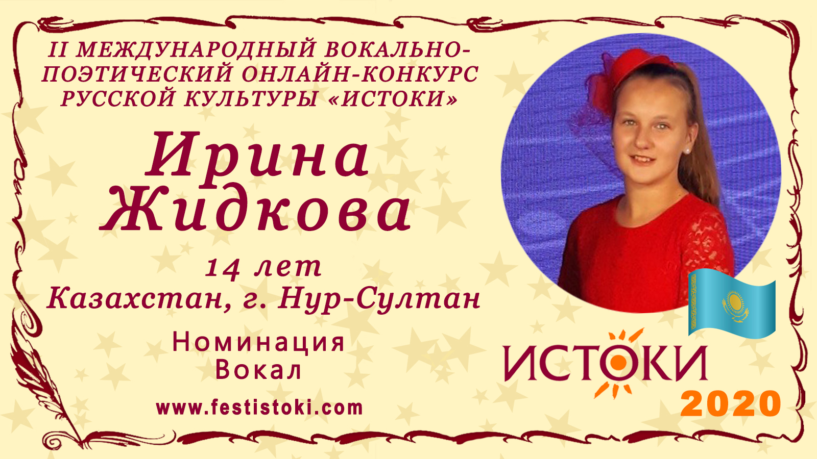 Участник II Международного вокально-поэтического онлайн-конкурса русской культуры «Истоки». Номинация - Вокал. Песня "Родина". Автор Э.Калашникова. Сайт: www.festistoki.ru / www.festistoki.com E-mail: festistoki@mail.ru
