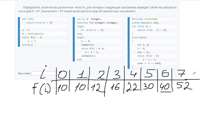 http://egoroffartem.pythonanywhere.com/ege/task/21 На сайте размещены другие задания по этой теме http://egoroffartem.pythonanywhere.com/ege/videotask/21 Список всех разборов 21 задания из ЕГЭ по информатике: https://www.egoroffartem.ru/ege/videotask/ Видео решения задач по ЕГЭ информатике https://vk.com/egoroff_channel В данном группе можете найти информацию о новых видео и задать вопросы по ЕГЭ Информатике Разбор задания № 21 ЕГЭ ИНФОРМАТИКА Тема задачи "Анализ программ с циклами и подпрограммами" Определите, количество различных чисел K, для которых следующая программа выведет такой же результат, что и для K = 47. Значение k = 47 также включается в подсчёт различных значений k. def f(n): return n*(n-1) + 10 i = 0 k = int(input()) while f(i) less k: i += 1 print(i) Функции в Python. Определение и вызов функции https://www.youtube.com/watch?v=DJAlfolEv9A Возвращаемое значение функции. Оператор return Python https://www.youtube.com/watch?v=cWyUODRGIDY