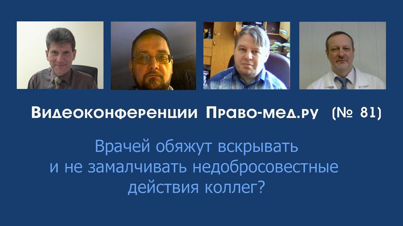 Видеоконференция Право-мед.ру № 81 от 11 января 2018 года, на которой рассматривалось предложение включить в клятву врача обязанность сообщать о недобросовестных действия коллег Тема: Врачей обяжут вскрывать и не замалчивать недобросовестные действия коллег? Рассмотренные вопросы 1. Существующие в настоящее время правовые механизмы выявления недобросовестных действий врачей, снижения влияния корпоративной солидарности? Их достаточность (недостаточность). 2. Как отразится на качестве и безопасности медицинской деятельности внесение изменений в клятву врача? 3. Будет ли реализована инициатива по внесению изменений в клятву врача ? Участники Панов Алексей Валентинович, главный редактор информационного портала Право-мед.ру, г. Омск , член АЮР Печерей Иван Олегович, доцент кафедры судебной медицины и медицинского права МГМСУ им. И. А. Евдокимова, г. Москва Степанов Игорь Олегович, врач - невролог, юрист, председатель Ярославской областной общественной организации инвалидов-больных рассеянным склерозом "Гефест", г. Ярославль, член АЮР Гаганов Дмитрий Борисович, юрист в сферы медицины, г. Санкт-Петербург Текстовая версия видео http://pravo-med.ru/video/13913/