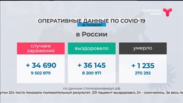 Заболеваемость вновь пошла вверх. Свыше 34,5 тыс. новых случаев коронавируса выявлено в России за сутки. Выписаны из больниц больше 36 тыс. пациентов. 1 235 не смогли победить вирус. Это данные сайта стопкоронавирус.рф. Что касается Тюменской области, за сутки 324 теста показали положительный результат. 231 пациент выздоровел, 24 скончались. За весь период в регионе число инфицированных превысило 79,5 тыс. http://www.youtube.com/user/TyumenTime?sub_confirmation=1
