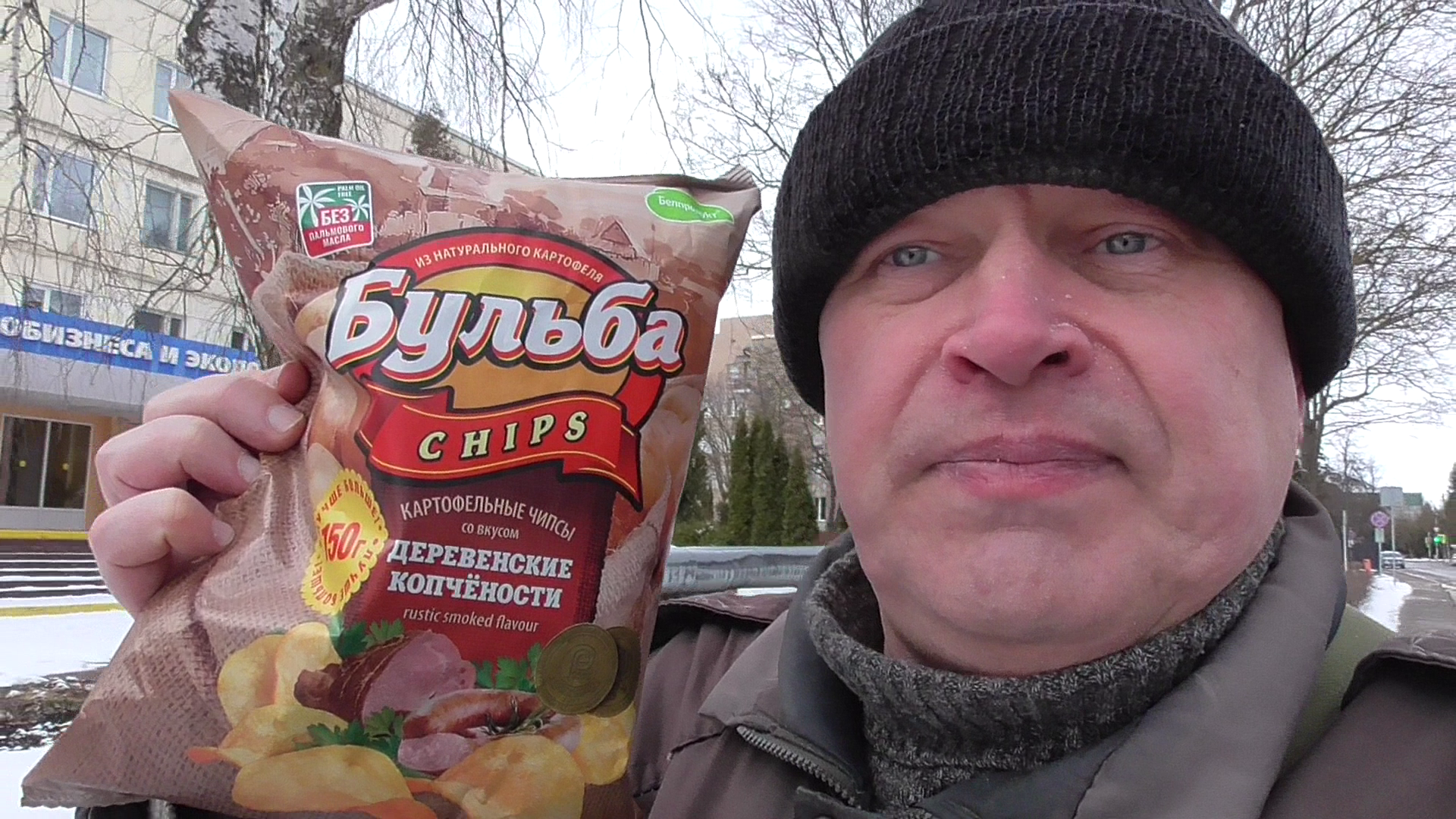 Я возле здания. Я рассказываю про чипсы Бульба
