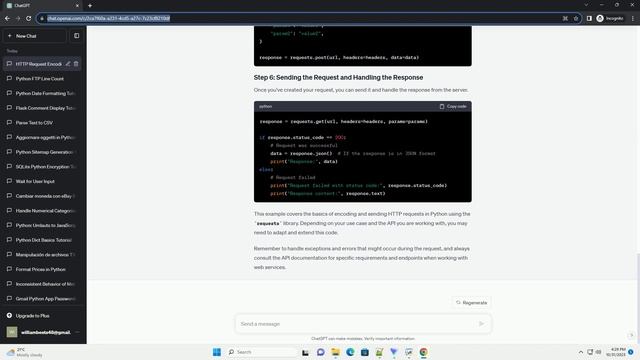 Encoding an HTTP request in Python is a fundamental skill when working with web APIs and web services. This tutorial will guide you through the process of creating an HTTP request, encoding it properly, and sending it to a server using the popular requests library. We'll use Python 3 for this tutorial. Prerequisites: Now, let's get started! First, you need to import the requests library, which simplifies sending HTTP requests in Python. To create an HTTP request, you typically need to specify the following components: Here's how to create a basic HTTP GET request: You can add headers to your request to provide additional information to the server. For example, you might need to set an API key or specify the content type. If you need to send parameters with your GET request (e.g., query parameters), you can encode them directly in the URL using the params parameter. When making a POST request, you may need to send data, such as JSON or form data, in the request body. Here's how you can do that: For JSON data: For form data: Once you've created your request, you can send it and handle the response from the server. This example covers the basics of encoding and sending HTTP requests in Python using the requests library. Depending on your use case and the API you are working with, you may need to adapt and extend this code. Remember to handle exceptions and errors that might occur during the request, and always consult the API documentation for specific requirements and endpoints when working with web services. ChatGPT
