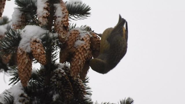 Клёст, зелёная самка, наблюдение птиц в Великом Новгороде, 28 октября 2023
