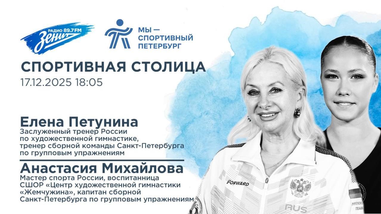 «Спортивная столица»: в гостях Елена Петунина, Заслуженный тренер России по художественной гимнастике, тренер сборной команды Санкт-Петербурга по групповым упражнениям и Анастасия Михайлова, мастер спорта России, воспитанница СШОР «Центр художественной гимнастики «Жемчужина», капитан сборной Санкт-Петербурга по групповым упражнениям