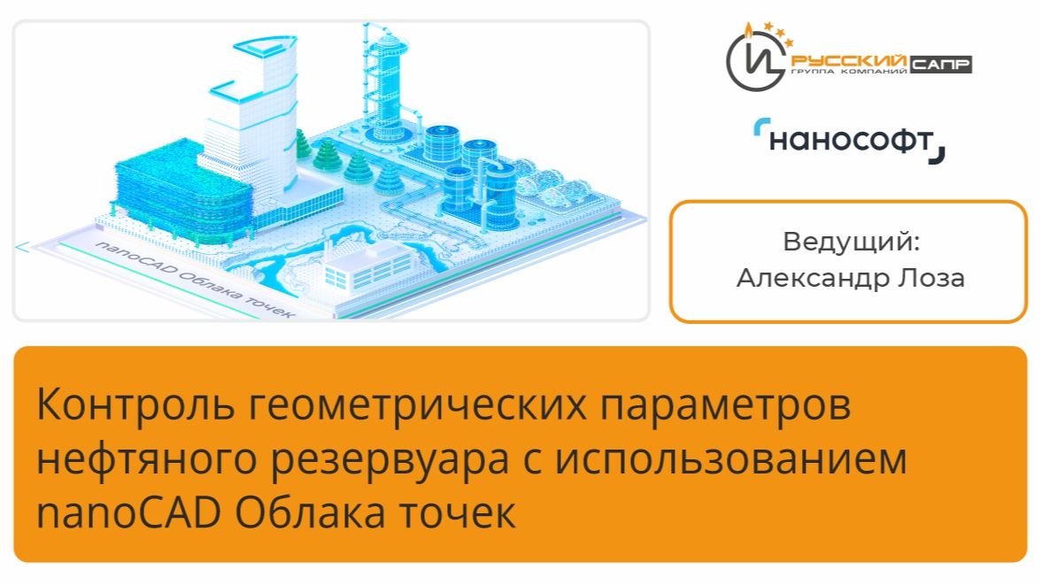 АО «Бюро САПР» (Группа Компаний «Русский САПР») − Премьер-партнёр компании «Нанософт разработка» и Фокус-партнёр по направлениям «Обработка данных лазерного сканирования», «Землеустройство», «Инженерия», «Строительство» и «Машиностроение» представляет запись вебинара, посвященного контролю геометрических параметров резервуара с использованием ПО nanoCAD Облака точек. Задачи контроля и мониторинга геометрических параметров вертикальных цилиндрических резервуаров для нефти и нефтепродуктов сейчас является очень актуальной как для вновь возводимых резервуаров, так и для резервуарных парков, эксплуатируемых достаточно продолжительное время, с целью обеспечения эксплуатационной надежности и долговечности объектов нефтедобывающего производства, а также предотвращения случаев загрязнения окружающей среды нефтью и возникновения взрыво- и пожароопасных ситуаций. На данном вебинаре мы получили исходные данные в виде облака точек лазерного сканирования, а затем продемонстрировали решение трех задач: контроль отклонений стенок резервуара от проектной формы, контроль вертикальности стенок резервуара и контроль горизонтальности фундамента (наружного контура днища). Для кого: инженеров и специалистов, занимающихся геодезическим контролем и мониторингом. Программа вебинара: • Загрузка облака точек. • Предварительная обработка облака: обрезка облака точек, использование видов для сохранения обрезанного состояния. • Контроль отклонений стенок резервуара от проектной формы методом сравнения фактической поверхности резервуара с объектом, моделирующим проектную поверхность. • Контроль вертикальности стенок резервуара: - Построение сечения вблизи уторного шва. - Векторизация полученного сечения. - Построение сравнительной модели. - Выполнение сравнения фактической поверхности резервуара и сравнительной модели. - Отображение результата сравнения. • Контроль горизонтальности фундамента или наружного контура днища от горизонтали. • Ответы на вопросы. Спикер: Александр Лоза, руководитель группы трехмерного проектирования АО «БЮРО САПР». Александр занимается внедрением САПР-решений более 20 лет, он инструктор по программному обеспечению nanoCAD Облака точек.
