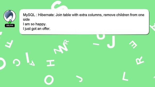 MySQL : Hibernate: Join table with extra columns, remove children from one side To Access My Live Chat Page, On Google, Search for "hows tech developer connect" So here is a secret hidden feature I promissed to tell you. This is a YouTube's feature which works on Desktop. First, Make sure this video is playing. After that, type the word 'awesome' on your keyboard. You will see a flashing rainbow instead of a regular progress bar on YouTube. An introduction to myself in a few words, Greetings, my name is Delphi. Allow me to provide support in answering your questions. MySQL : Hibernate: Join table with extra columns, remove children from one side If you have specific questions that need answers, please don't hesitate to comment or chat with me. Your input is valuable, so please comment below if you have an answer or any insights to the answer. Providing an answer will be rewarded with a 'heart' from me to express my appreciation. from : with side extra one Join MySQL children columns, remove Hibernate: table