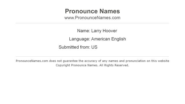 Audio and video pronunciation of Larry Hoover brought to you by Pronounce Names (http://www.PronounceNames.com), a website dedicated to helping people pronounce names correctly. For more information about this name, such as gender, origin, etc., go to http://www.PronounceNames.com/Larry+Hoover
