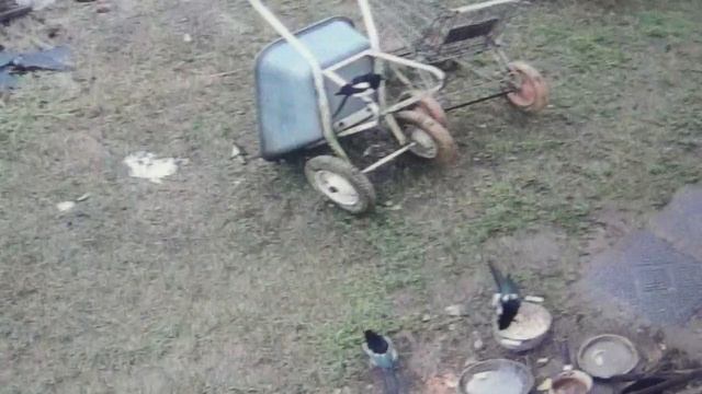 Села сорока на тележку и следит за кормушкой