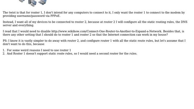 The setting to connect one router to another, how? Helpful? Please support me on Patreon: https://www.patreon.com/roelvandepaar With thanks & praise to God, and with thanks to the many people who have made this project possible! | Content (except music & images) licensed under CC BY-SA https://meta.stackexchange.com/help/licensing | Music: https://www.bensound.com/licensing | Images: https://stocksnap.io/license & others | With thanks to user Graviton (superuser.com/users/522), user CheeseConQueso (superuser.com/users/68301), and the Stack Exchange Network (superuser.com/questions/735682). Trademarks are property of their respective owners. Disclaimer: All information is provided "AS IS" without warranty of any kind. You are responsible for your own actions. Please contact me if anything is amiss at Roel D.OT VandePaar A.T gmail.com